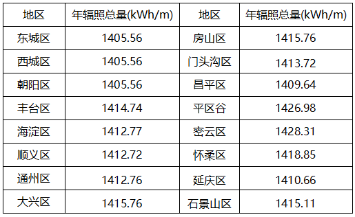 以北京为例进行说明,北京各区县水平面年太阳能总辐射量参考值(kWh/m2·a):