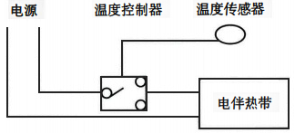 ②温度控制电伴热系统,可用于需要精确维持管壁温度或加热体内的介质温度的场合,见图。温度控制电伴热系统设置有显示控制仪及温度传感器,在关键的电伴热温度控制回路中,宜设温度超限报警和/或联锁。