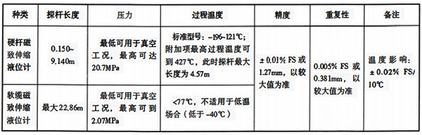 表1 硬杆磁致伸缩液位计和软缆磁致伸缩液位计的主要参数
