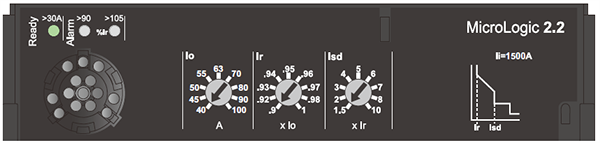 再例如某电子式脱扣器的塑壳断路器,其脱扣器额定电流为100A,过负荷保护整定电流Io粗调范围40A~100A,即0.4~1.0倍脱扣器额定电流,过负荷保护整定电流Ir微调范围0.9~1.0。