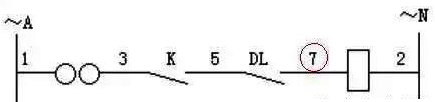 ③对调控制回路的电源极性,即相线换成零线,零线换成相线。按一般设计习惯,图纸左边的控制电源为相线,右边为零线,而继电器一般靠近右边控制电源线布置,即一般继电器的线圈直接接到零线,如下图所示。按此接线,当DL接点距离继电器很远时,电缆7感应的电压很高,就可影响继电器的返回。对调相线和零线后,继电器线圈两端等电位,则可消除感应电压对继电器返回的影响。