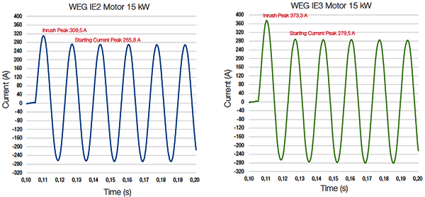 以15kW电动机为例,IE2电动机的冲击电流峰值309.5A,起动电流峰值为265.8A,而IE3电动机的冲击电流峰值为373.3A,起动电流峰值为275.5A,无论是冲击电流还是起动电流,IE3都比IE2电机高。