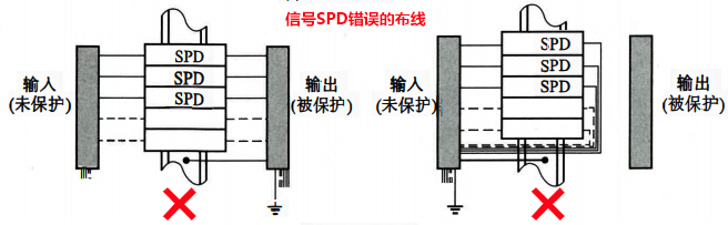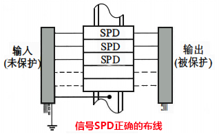 信号浪涌保护器的接地线与被保护设备的外壳接地端之间需用跨接线连接,并在SPD接地点处连接到大地。非本安信号SPD在机柜内的布线如下图所示。