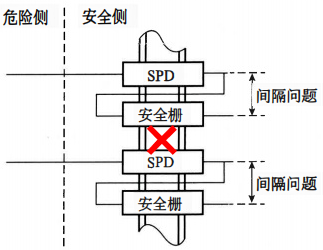 当用本安型信号浪涌保护器及连接的设备时,应将本安型信号浪涌保护器与安全栅分开安装在两排不同的导轨上,以满足危险侧与安全侧接线端子之间50mm的间隔要求,同时可使得布线更加整齐,如下图所示。