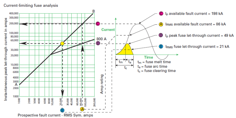 例如,某电气系统的预期短路电流为86kA(A点),预期短路电流峰值为198kA(C点)。断路器或熔断器的额定电流为800A,其短路分断能力至少为86kA,只有这样才具备分断预期短路电流的能力。