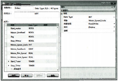 用户自定义数据结构。用户自定义数据结构(UDF)是在编程时为了某一控制任务组织相关数据而建立的数据结构,以便于数据的查找、监视和传输等。在建立数据结构的过程中,数据元素的定义顺序与存储器空间的占用有关。BOOL类型占1位,每建立一个BOOL元素,都会存放在剩余的空间上。如果空间不够,再划出新的32位字的空间。同理,SINT类型占8位,每建立一个SINT元素,都会存放在剩余的空间上。如果空间不够,再划出新的32位字的空间。其他类型以此类推。一个完整的用户自定义数据结构UDF的大小一定是32位的整数倍。