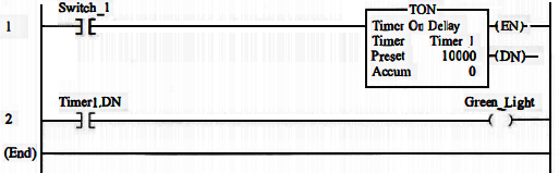 梯形图一般由2条母线和指令构成的梯级(Rung)或阶梯组成,每条梯级包括输入指令和输出指令。输入指令和左母线相接,输 出指令最后连接右母线。梯形图以结束语句(END)表示程序结束。典型的梯形图如图所示,这是一个延时通逻辑,当开关Swith_1闭合后10s,绿灯Green_Light亮。