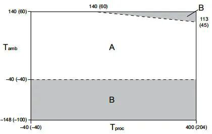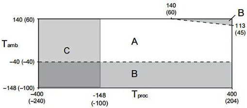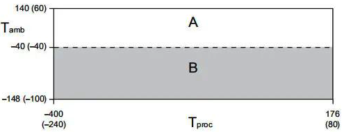 在所有情况下,艾默生质量流量计电子部件不能在环境温度低于-40°C或者高于60°C的环境温度下使用。艾默生质量流量计传感器可以在如下温度限制图表所示的过程和环境温度范围内使用,如果过程条件接近灰色区域,请咨询艾默生公司。