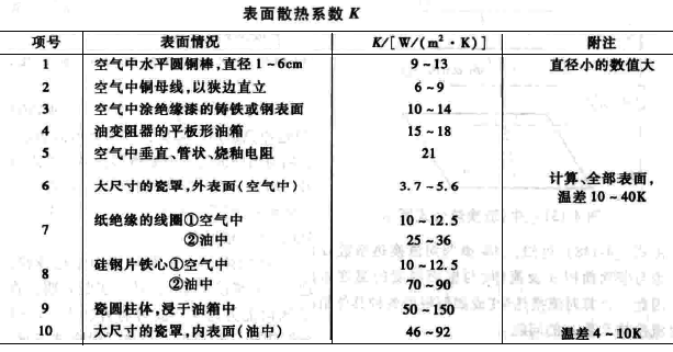 综合散热系数Kt通常靠实验确定,在一定温度范围内其值取常数,如下表: