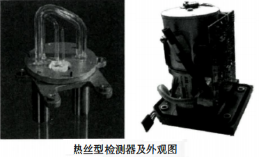 热导池的机械结构有多种形式 ,下面两个图为ABB公司的生产的两款不同用途的检测器。薄膜型检测器在半导体硅材料上光刻测量电阻和参比电阻,这类检测器灵敏度高,但耐腐蚀能力相对较差;热丝型检测器的热丝外面镀玻璃层,耐腐蚀能力和使用寿命较长,价格也相对比较昂贵。