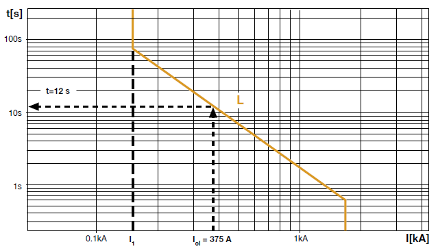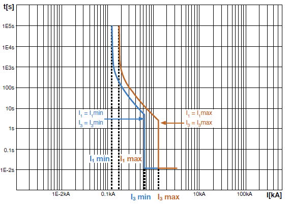介于I1max和I3min之间的电流,断路器的过载保护会动作,动作时间范围介于该电流对应的垂直线与反时限曲线的两个交点之间。
