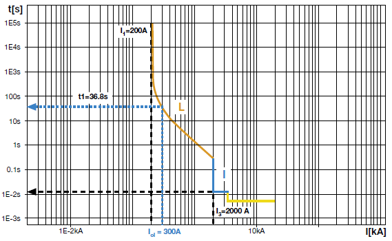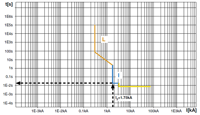 瞬时保护I曲线所对应的电流值,当故障电流大于等于瞬时保护整定值时断路器动作(蓝色线)时,瞬时保护立即动作。