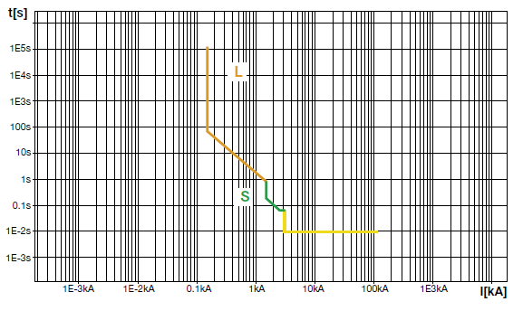 第二种类型的保护曲线是电子式脱扣单元保护曲线,常见于塑壳断路器和框架断路器,电子式脱扣单元可以实现长延时L、短延时S、瞬时I和接地故障G等保护。