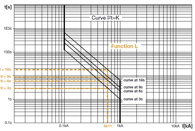 ABB在其白皮书中将长延时保护的反时限曲线的允通能量定义为常数即I2t=K如,下图所示。通常长延时保护的延时时间一般默认为6Ir所对应的时间,常见的有3s,6s,9s和18s等,时间数值越大,代表断路器在6倍Ir的过电流下的保护延时时间越长。