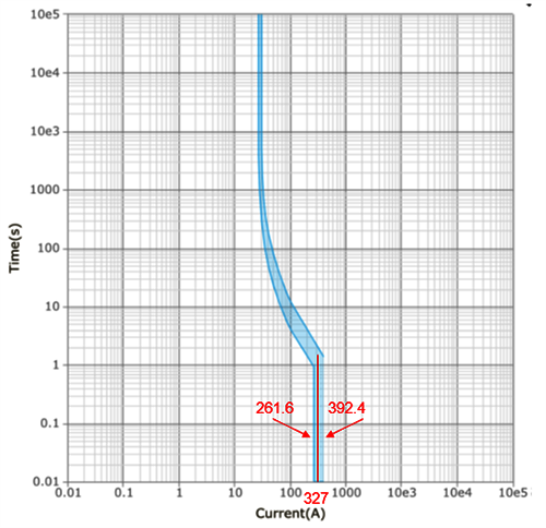 前面提到GV2ME22C电动机保护断路器的磁脱扣电流值为327A±20%,如下图所示,当电流低于261.6A(327×0.8)时磁脱扣一定不动作,当电流大于392.4A(327×1.2)时磁脱扣一定动作,当电流介于261.6A与392.4A之间时,磁保护有可能动作,有可能不动作。