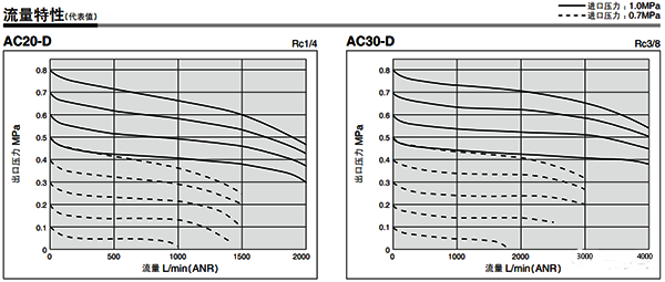 如AC30-D三联件在进口压力1MPa,出口压力在0.7MPa,压降0.05~0.08MPa的情况下,那么三联件流量值为1000L/min~2000L/min。
