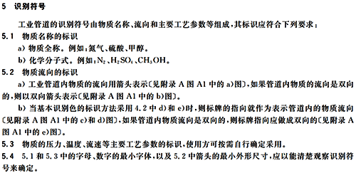 当采用②③④⑤方法时,二个标识之间的最小距离应为10m,③④⑤的标牌最小尺寸应以能清楚观察识别色来确定。当管道采用②③④③基本识别色标识方法时,其标识的场所应该包括所有管道的起点、终点、交叉点、转弯处、阀门和穿墙孔两侧等的管道上和其他需要标识的部位。