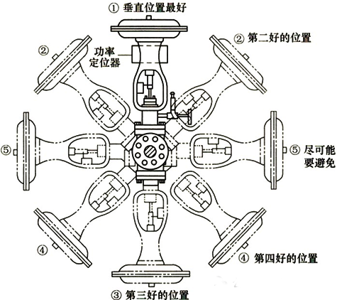调节阀安装位置比较图如下图所示,安装位置①是最佳安装位置,即垂直安装;安装位置⑤是最差位置,要尽量避免;安装位置②是次选位置。如果没有足够空间,可选择位置③和④。