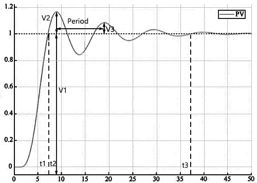 响应曲线超出稳态值的最大偏差V2与新稳态值V1之比。超调量σ用来表征过程变量偏离稳态值的程度,原则上越小越好。由于实际工艺过程一般不允许出现较明显的超调,因此在控制回路优化时,应尽量保证过程变量的设定值阶跃变化响应为适度超调或者过阻尼无超调。