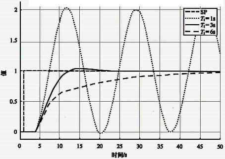 可以保证设定值阶跃响应有超调无振荡。通过多次的设定值阶跃响应可以得到和前面一样的结论:纯比例控制器总是有余差。为了消除余差,可以使用比例积分控制器。积分作用通过对偏差的累积消除余差,偏差累积的速度应该和被控对象的动态特性时间常数相匹配。我们使用基准模型、Kc=0.25和不同积分时间进行闭环设定值阶跃测试。设定值阶跃响应曲线如图1所示。当积分时间太小(积分作用太强)时,设定值阶跃响应会超调甚至振荡。当积分时间太大(积分作用太弱)时,设定值阶跃响应缓慢,表现为“拖尾”现象。合适的积分时间应和被控对象的时间常数匹配。