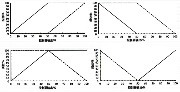PID控制器分程动作根据调节阀特性和控制要求有多种形式,图2是常见的四种调节阀分程方式。在实际应用中也有交接点附近重叠或者死区分离的情况。特殊情况下也有最终控制元件在整个范围内部分有最小或最大开度。