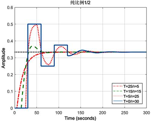 在一个由增益K、时间常数T和纯滞后时间τ确定的一阶纯滞后过程中,获得等幅振荡的纯比例与增益K成反比,与T/τ成正比。如下图所示,同样的纯比例1/2,随着T/τ从5到0闭环响应从无超调,到有超调不振荡再到衰减振荡。