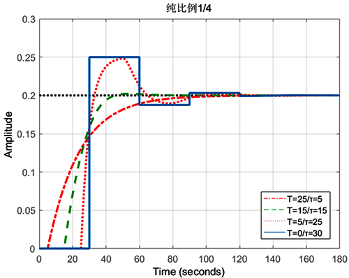 如果希望所有的一阶纯滞后自衡对象都1/4衰减振荡,则工程上的比例边界就可以利用ZN法砍一半设置为1/2K。在现代整定方法中都追求有超调无振荡,则工程上的比例增益边界可以继续砍一半为1/4K。这个比例增益既是所有一阶纯滞后自衡对象的比例边界,也是一个适用于所有一阶纯滞后自衡对象的通解。通解对不同T/τ的响应如下图。