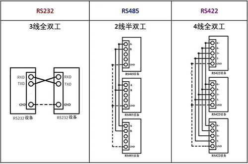典型工作方式,RS232:3线全双工;RS485:2线半双工;RS422:4线全双工。
