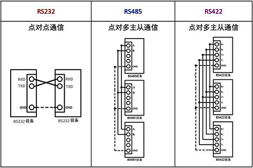 RS232:只能实现点对点通信;RS485和RS422:能实现点对多主从通信。