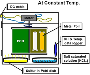2、240小时极限电压电流通电60℃20rpm80%RH氯化钾饱和水溶液的湿硫黄蒸汽实验:该实验多外发第三方进行,实验过程或实验后确认功能是否正常以及CCD观察PCB过孔及焊盘引脚处有无腐蚀或树枝状离子迁移的现象。