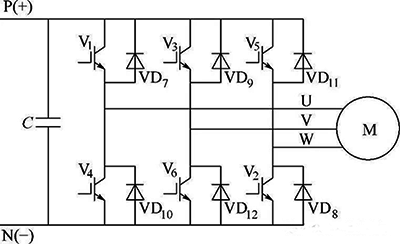 变频器的IGBT是单向元件,只能单向导通,为了给电机与电源提供一个反馈通路,故在每只IGBT上反并了一个二极管,只不过,反馈的电能用于对电容充电。如下图: