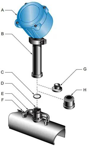 A. 变送器或核心处理器;B. 延长杆 ;C. O型圈 ;D. 穿通管;E. 卡箍;F. 卡箍螺丝;G. 塑料塞;H. 塑料帽