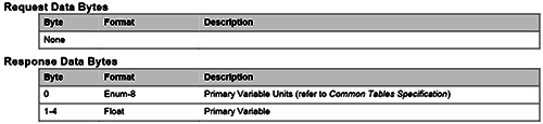 Read Primary Variable,读主变量,将以IEEE 754浮点类型返回主变量的值(5字节,字节0:主变量单位代码,字节1-4:主变量)。
