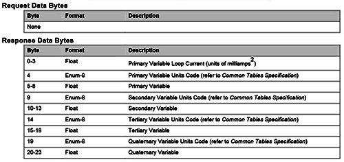 Read Dynamic Variable and Loop Current,读动态变量和主变量电流,读主变量电流和最多4个预先定义的动态变量(只读PV时最少9字节,读PV+SV+TV+QV时最多24字节,字节0-3:主变量电流,字节4:主变量单位代码,字节5-8:主变量,字节9:第二变量单位代码,字节10-13,第二变量,字节14:第三变量单位代码,字节15-18:第三变量,字节19:第四变量代为代码,字节20-23:第四变量)。