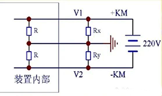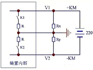 Rx与Ry属于待测电阻,分别属于正对地电阻和负对地电阻,求出Rx和Ry的值,就能确定正、负对地的绝缘状况。