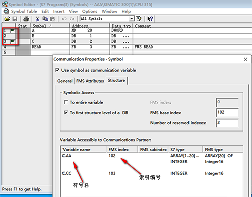 那我们先了解一下PROFIBUS-FMS通信服务是怎么实现的。FMS是采用主从方式,主站通过“读”、“写”指令与从站进行数据交换,由于各厂家地址区定义的差异性,例如西门子有DB、M、I、Q等地址区,但是别人家不一定是这样呀,那就采用符号名的方式,给PLC变量命名一个符号名称,或者采用INDEX方式,给变量一个编号,例如101、102等。S7-300/400被读写的变量需要在符号表中一一定义。