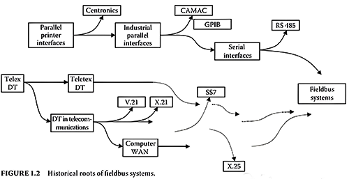 现场总线的起源来自四个方面的技术进步:基于电话网络的数据传输协议,如V.21、X.21等,是现场总线串行数据传输的鼻祖。实验测量仪器和计算机外设的并行总线接口标准化和数据实时传输。电子工程师定义标准化的通讯接口的理念也被现场总线继承了。另外多个空间上分布的多个实验仪器数据如何多站multidrop实时传输的标准,如用于核物理的计算机自动测量和控制CAMAC标准和电子测试设备总线GPIB,也建立起来了。计算机科学理论的发展OSI模型自顶向下的分层设计理念,后来成为了现场总线分层设计的核心指导思想。电子技术的发展,集成电路微型化、I2C、微处理器、连接器技术、RS-485差分信号抗干扰,成为后来总线标准的硬件技术的基石。