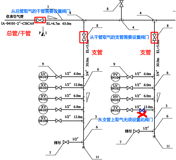 2)上图出自HG/T20638中仪表空气管道系统图,也可以参考SHT3521中11.1.4