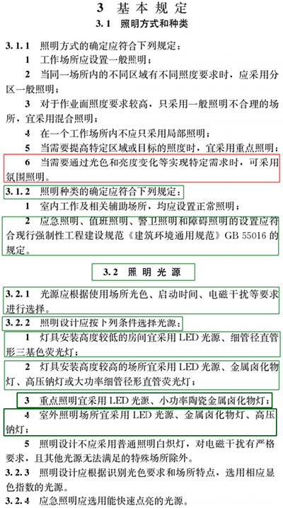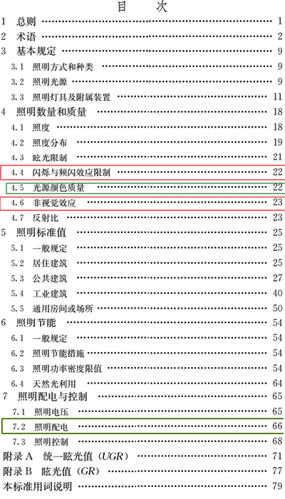 本次新标准GB/T50034-2024与GB50034-2013版的老标准相比,内容方面的改动较大,其中更是对健康照明、绿色节能、驱动电源这些内容新增了相应的规定,尤其是在指标要求上。下面fkswng仪表将新标准GB/T50034-2024有改动的地方用绿框标出,新增的内容用红框圈出,以方便大家查阅。