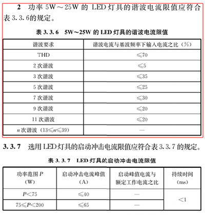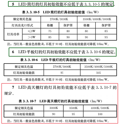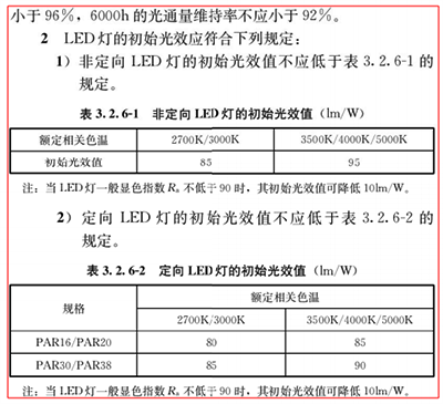 表3.2.6-1与表3.2.6- 2中分别对LED灯具不同色温的初始光效值给出相应的规定,对于显色指数Ra不低于90的灯具,可降低10lm/W,同时还对LED细分为非定向与定向2类。
