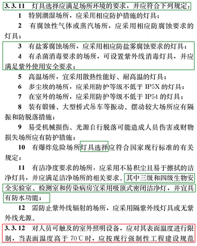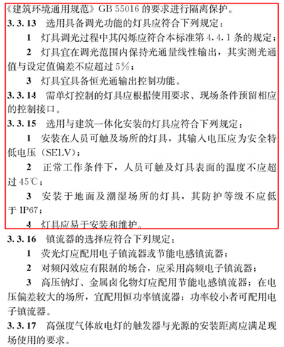 我们在选择灯具时必须符合上面的这些条款,尤其新标准中3.3.12这一条,当我们选用传统光源的灯具时,其表面温度一般都会高于70度,所以我们一定要按照GB55016 《建筑环境通用规范》中的要求进行隔离保护。
