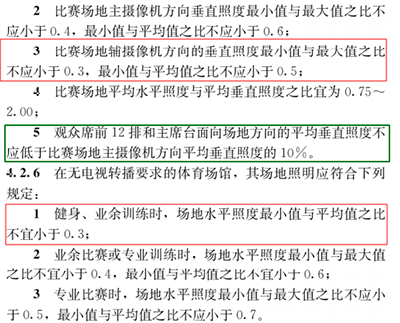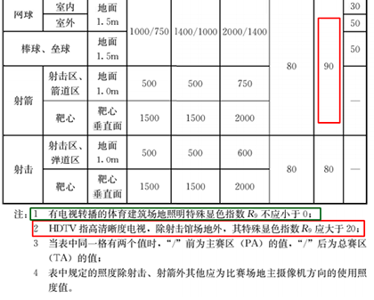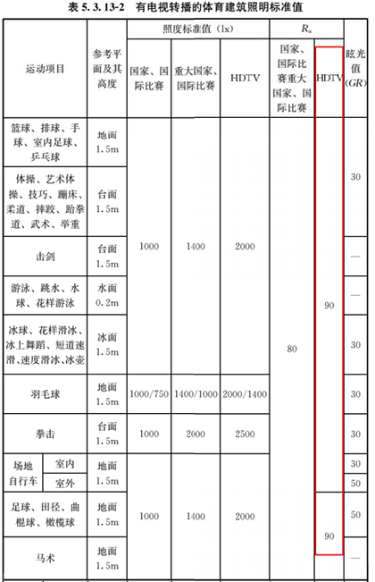 表5.3.13-2 有线电视转播的体育建筑照明标准值中,取消了旧版色温要求,HDTV显色指数由旧版Ra>80,改为90。