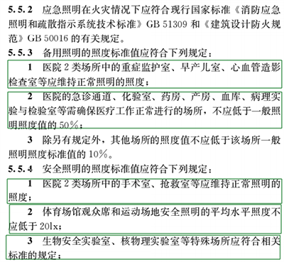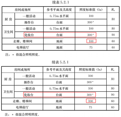 在5.2.1 住宅建筑照明标准值中针对以下2处的照度标准值进行了提高,一处是卧室的床头或卧室阅读使用;一处是走廊、楼梯间。并且新增了在卫生间使用化妆台时的照度标准值。