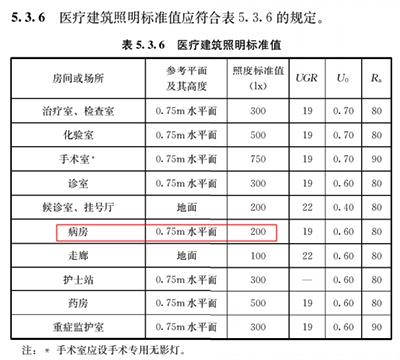 5.3.6 医疗建筑照明标准值中,病房的参考平面及其高度规定为0.75m水平面,在旧标准中为地面,其照度标准值也进行了调整,改为200lx。
