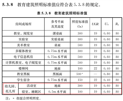 5.3.8 教育建筑照明标准中新增了幼儿园、托儿所不同区域的照明标准,但这些标准中有些标准值远低于地方标准中的对应值,所以在接受此类设计时一定要结合当地照明标准进行设计。
