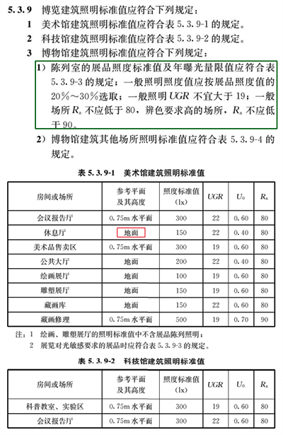 5.3.9-1美术馆建筑照明标准值表中,将旧标准的休息厅参考平面改为地面。