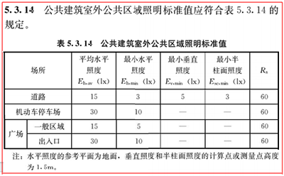 5.2.2与5.2.4增加了道路照明相关标准值,并细分为主要道路、次要道路、健身步道和公共机动车库的车道四种场景