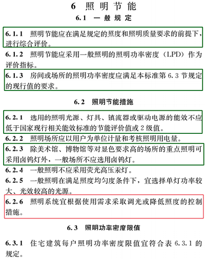 6.3 照明功率密度限值中现行值和目标值,比旧版标准中均有提升,这里就不再赘述。