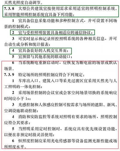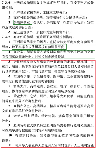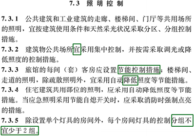 这些条款中改动的地方较多,比如7.1 照明电压,7.3 照明控制等细节方面的调整;新增内容包括不限于7.3.7 中增加了公众建筑走廊和楼梯间、校园、酒店大厅、老人空间的照明控制措施、7.3.9 中特定场所的照明控制等等内容,这些都是与旧标准有所不同,所以建议大家还是好好看一看,重点关注,相信一定是有很多收获的。