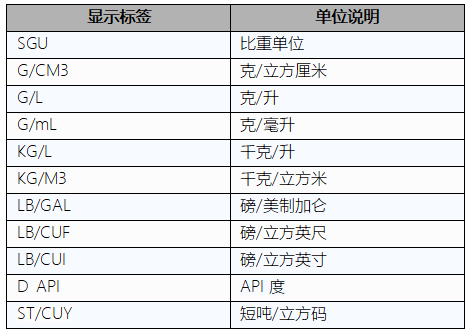 高准1700/2700系列变送器为密度测量单位提供了一组标准的测量单位。